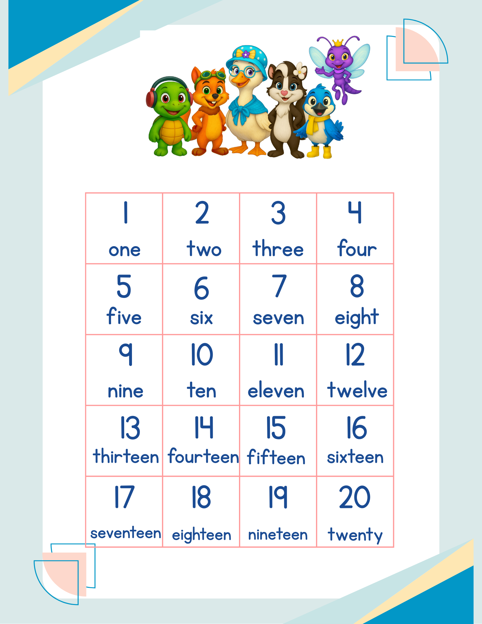 Introduce numbers 1–20 through friendly characters and objects from Gooses Corner. Children practice counting, number formation, and one-to-one correspondence while building foundational math skills. Ideal for early math lessons, centers, or quiet practice time.